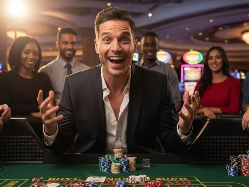 Joyful poker player expressing excitement in a best online casino PH setting