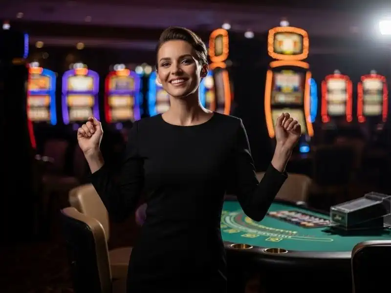 Licensed Casinos Smiling Woman Playing Slot Game VMWIN-formerly-known-Vivamaxwin excitement